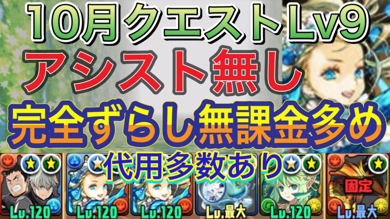 【アシストなし 完全ずらし】10月クエストダンジョンLv9をアシスト無し完全ずらしのバレンタインノア編成で簡単攻略!無課金多めの編成難易度低めなので誰でも組みやすい編成です!10月クエスト【パズドラ】